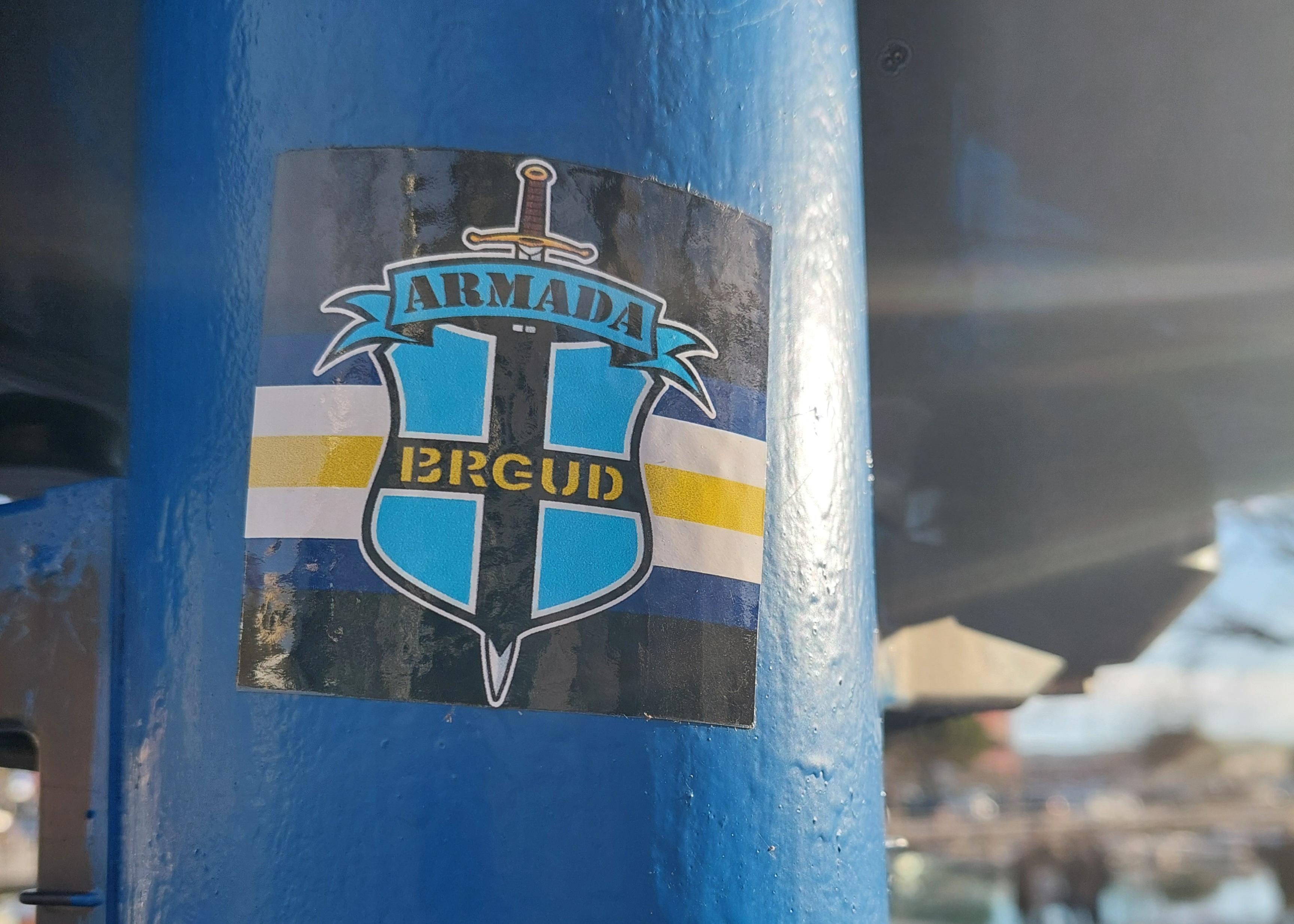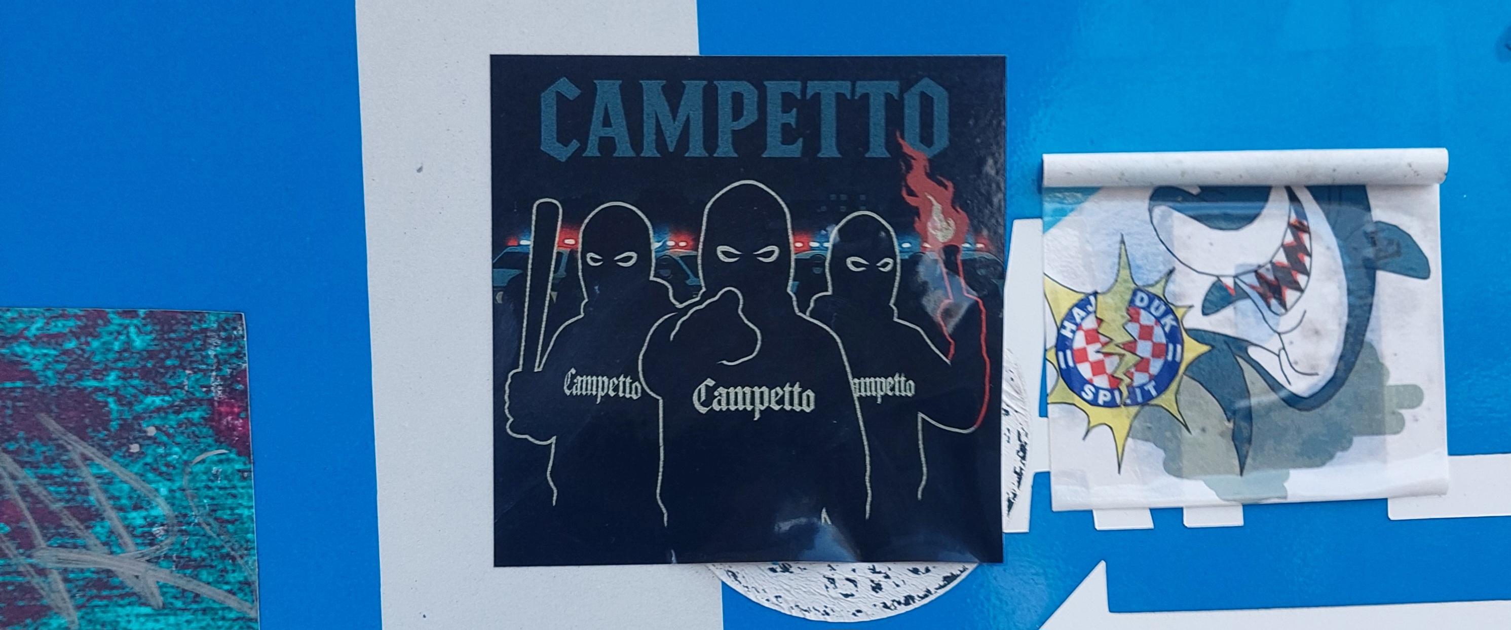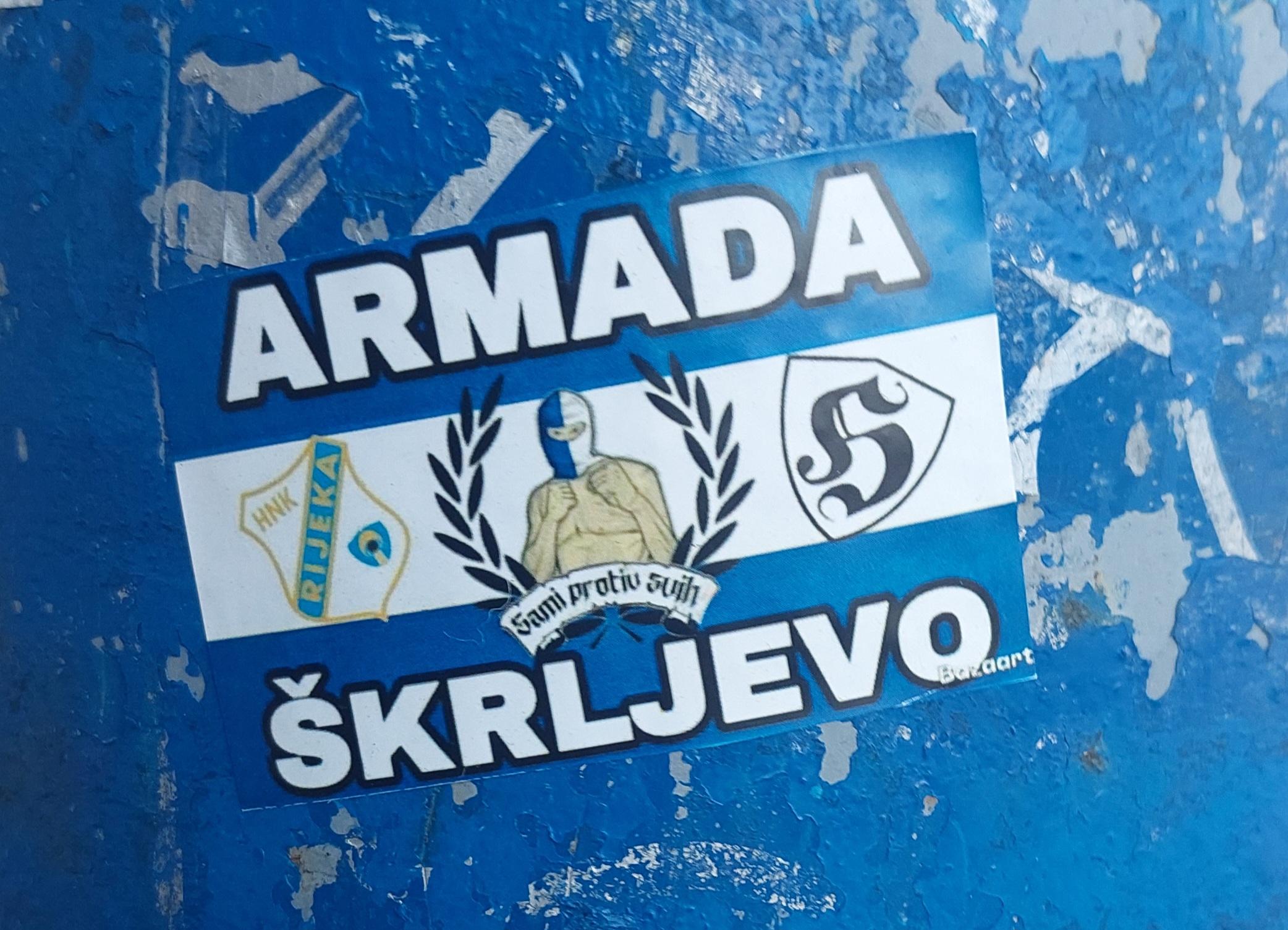 Ovo je naljepnica s logotipom NK Rijeke u kombinaciji s lovorovim vijencem te sloganom ‘über alles’ (netko, društveno odgovoran/na, pokušao/la je pokidati naljepnicu pa se ne vidi dobro dio ‘alles’). Riječ je o njemačkom izrazu koji znači ‘iznad svih’.
