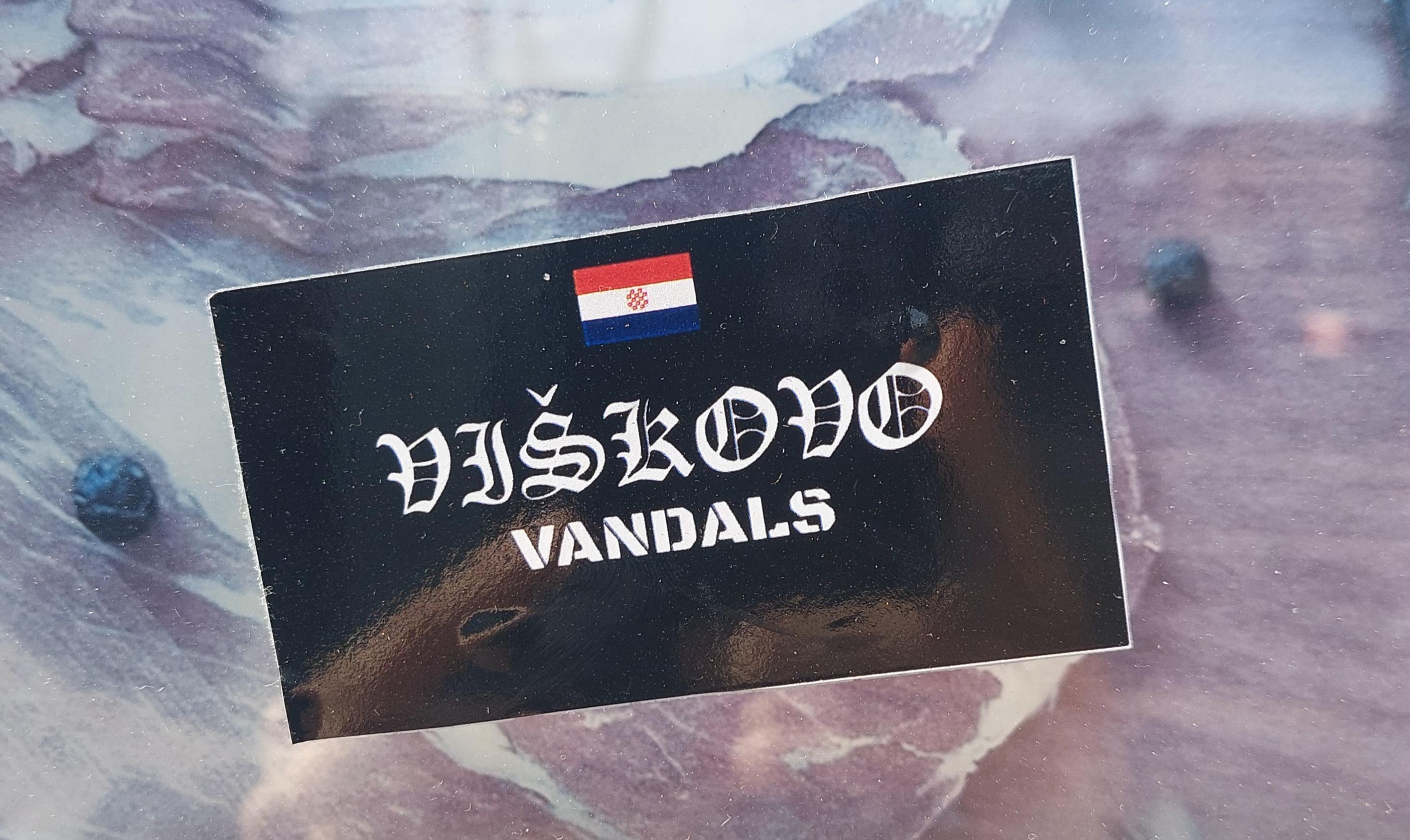 Na ovoj naljepnici stoji natpis “Vandali Viškova”, pri čemu je ‘Viškovo’ ispisano gotičkim fontom Blackletter koji se često poistovjećuje s Frakturom, iako je ovdje riječ o jednoj od njegovih modernih varijanti.